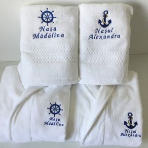 Un cadou foarte potrivit pentru finii Dvs, cu ocazie cununiei sau a nuntii de bumbac: un set de halate de baie si/sau prosoape, din bumbac 100%, calitate premium, personalizate prin broderie asa cum si-ar dori!